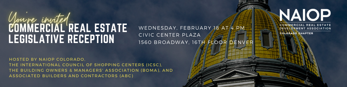 Please join NAIOP Colorado, the Commercial Real Estate Development Association, the International Council of Shopping Centers (CSC), the Building Owners & Managers' Association (BOMA), Associated Builders and Contractors (ABC) and special guest legislators for an early evening of legislative activities on Wednesday February 18, 2026. Bring a friend or colleague! SCHEDULE: 4:00 PM - 5:00 PM Program and Legislative Update SUGGESTED ATTIRE: LOCATION: REGISTRATION: REGISTER HERETHANK YOU TO OUR PUBLIC POLICY PATRONS: